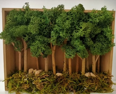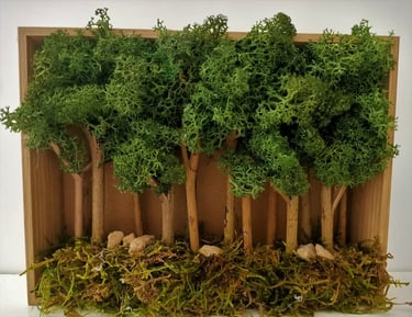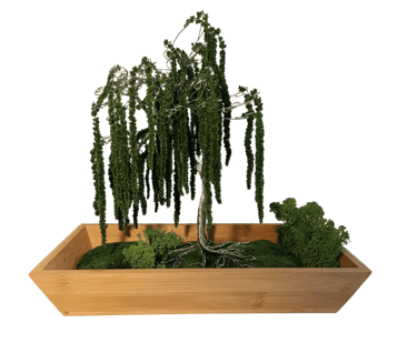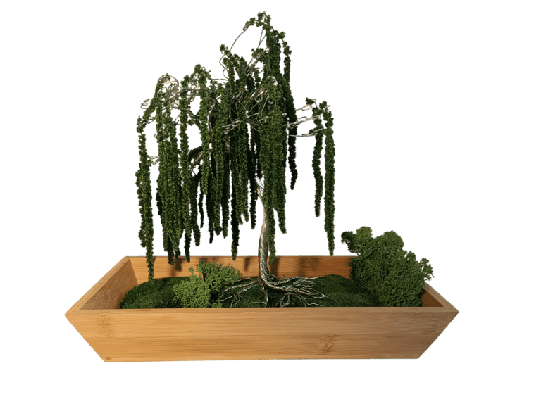 Cada árbol está meticulosamente elaborado a mano, y combina el musgo y las plantas preservadas con materiales como madera, que aporta calidez, la textura del metal o la piedra que agrega un toque moderno, estructura y robustez.