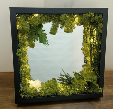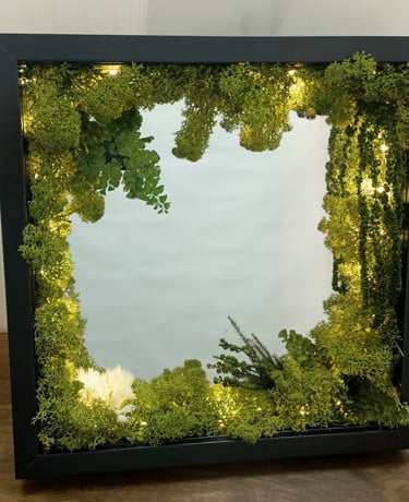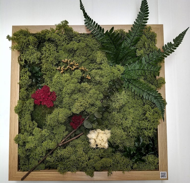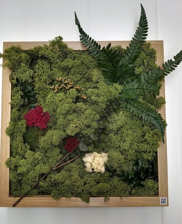 Decoración natural con mugo y plantas preservadas que crean un ambiente encantador en tus paredes o sobremesa añadiendo un toque orgánico y distintivo a tu decoración.