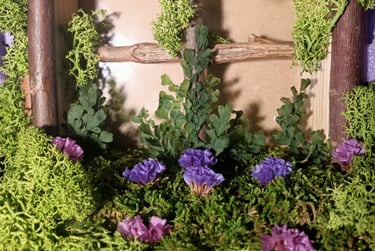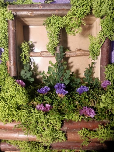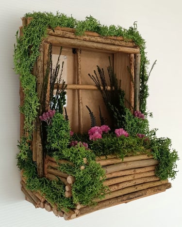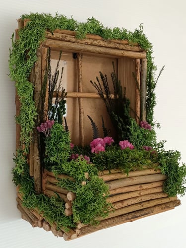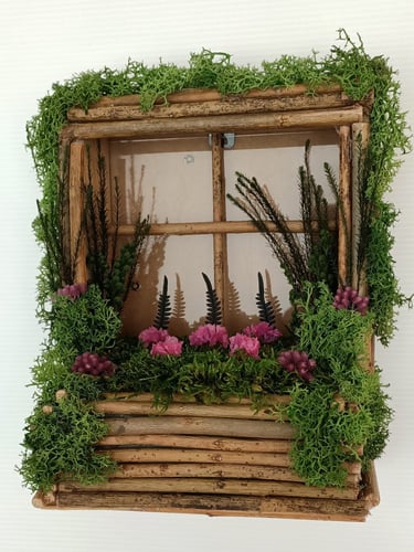 La ventana en miniatura es una encantadora creación elaborada con palitos naturales, adornada con musgo En su pequeño balcón, se asoman flores preservadas, agregando un toque de color y vida a esta pintoresca escena en miniatura.